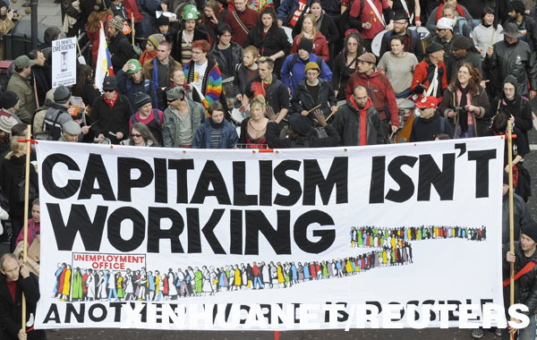 3月28日,在英国伦敦市中心,抗议者走上街头示威。当日,伦敦爆发大规模游行,示威者举着横幅标语,表达对贫困、就业和气候现状的不满。新华社/路透