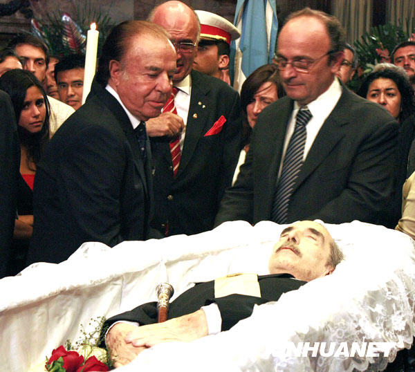 4月1日,在阿根廷首都布宜诺斯艾利斯的国会蓝色大厅,阿前总统梅内姆(前左)等瞻仰劳尔·里卡多·阿方辛遗体。新华社发(克劳迪奥·卡尔博尼摄)