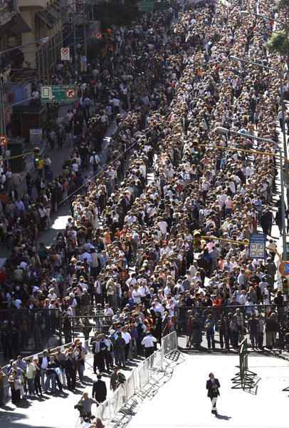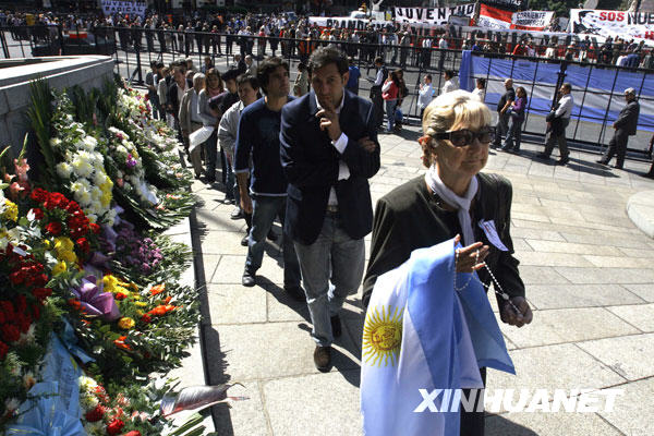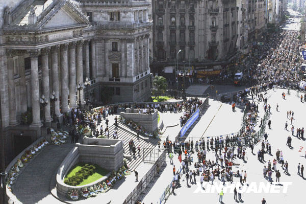 4月1日,阿根廷民众在首都布宜诺斯艾利斯的国会大楼外等待瞻仰前总统劳尔·里卡多·阿方辛的遗容。新华社发(马丁·萨巴拉摄)