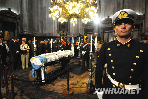 4月1日,在阿根廷首都布宜诺斯艾利斯的国会蓝色大厅,士兵守护前总统劳尔·里卡多·阿方辛的灵柩。新华社发(克劳迪奥·卡尔博尼摄)