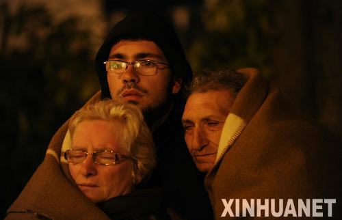 4月7日凌晨,在意大利中部地震灾区拉奎拉市,三名灾民裹着毯子依偎在一起。新华社记者武巍摄