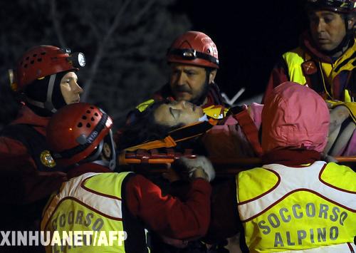 4月7日,在意大利阿布鲁佐区首府拉奎拉市,在地震废墟中被埋了20个小时后获救的一名女子被送往医院救治。新华社/法新