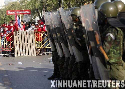 4月12日,在泰国首都曼谷,士兵在反政府示威者聚集处附近警戒。据泰国媒体报道,泰军方12日下午开始在位于首都曼谷的集拉达王宫、国会、外交部等地部署士兵,以确保这些场所安全。当天下午,泰国总理阿披实宣布在首都曼谷和中部5个府部分地区实施紧急状态法。新华社/路透