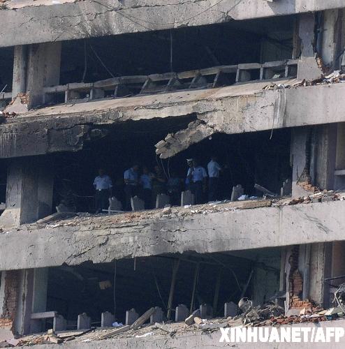 资料图片: 2009年2月21日,在斯里兰卡首都科伦坡,安全人员在遭到飞机撞击的税务部大楼内勘查。科伦坡20日晚遭到反政府武装泰米尔伊拉姆猛虎解放组织(猛虎组织)空袭,一架猛虎组织飞机被击落,另一架飞机被击中后坠落在斯税务部大楼上。科伦坡国立医院医生赫克托·维拉辛哈向媒体称,空袭导致4人丧生,51人受伤。新华社/法新