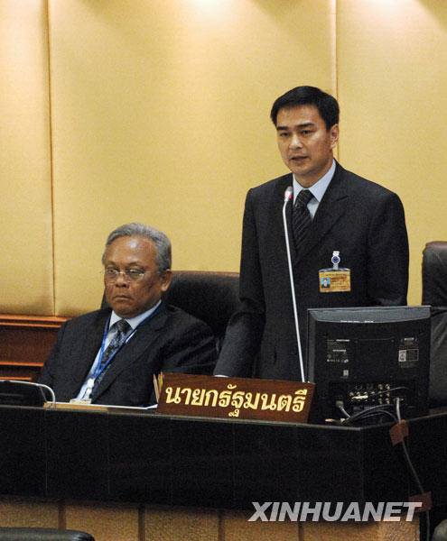 4月22日,在泰国曼谷的国会,泰国总理阿披实(右)在上下两院联席会议上讲话。 泰国总理阿披实当日在国会说,政府13日采取措施驱散示威者是为了恢复社会安宁,是正当合理的行动。 新华社发(塔纳摄)