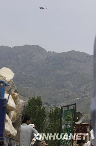 这张4月27日在巴基斯坦迪尔地区拍摄的照片显示,巴基斯坦军方一架参加打击行动的直升飞机从空中飞过。巴基斯坦内政部长马利克28日说,军方已经在西北边境省迪尔地区的行动中打死70名武装分子。军方26日开始打击行动, 目前行动仍在继续。新华社发