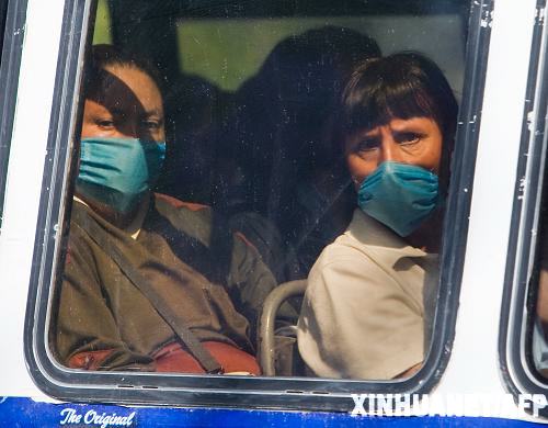 4月27日,在墨西哥首都墨西哥城,两名戴着口罩的市民向车窗外张望。墨西哥卫生部长科尔多瓦当日在新闻发布会上宣布,墨西哥政府决定从27日开始将停课范围从原来的疫区扩大至全国,停课包括大中小学及幼儿园等教学场所,严防猪流感疫情蔓延。 新华社/法新