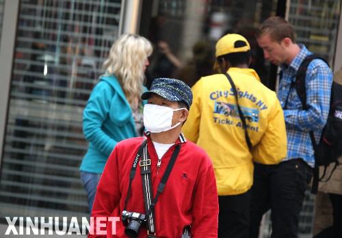4月29日,一名戴着口罩的日本游客在美国纽约时报广场观光。当日,美国疾病控制和预防中心代理主任理查德·贝塞尔表示,美国境内确诊的猪流感患者人数已经上升至91人,其中包括一名现已死亡的墨西哥儿童。 新华社记者刘欣摄