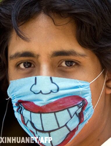 4月28日,在墨西哥首都墨西哥城,一名男子带着绘制着笑容图案的口罩。截至29日,全球有8个国家报告人感染猪流感的确诊病例,其中墨西哥报告152个疑似和确诊猪流感致死病例,其中确诊至少7例。墨西哥需要住院治疗的疑似病例大约为2000例。 新华社/法新