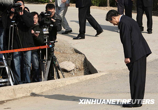 4月30日,韩国前总统卢武铉从位于首都首尔东南约450公里的家中离开,准备接受检察机关的质询时向媒体记者鞠躬。新华社/路透
