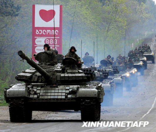 5月5日,一队格鲁吉亚坦克行驶在首都第比利斯附近。格内务部5日宣布,格强力部门当天联合挫败一起由格高级军官策划的军事叛乱,该叛乱旨在破坏即将于6日举行的北约军事演习,并推翻由总统萨卡什维利领导的现政权。新华社/法新