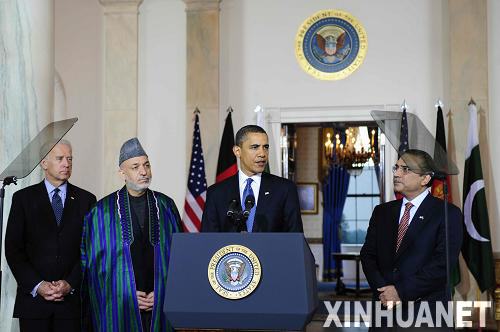 5月6日,美国总统奥巴马在首都华盛顿白宫会见到访的阿富汗总统卡尔扎伊(左二)和巴基斯坦总统扎尔达里(右一)后发表讲话。美国副总统拜登(左一)出席。 新华社记者张岩摄