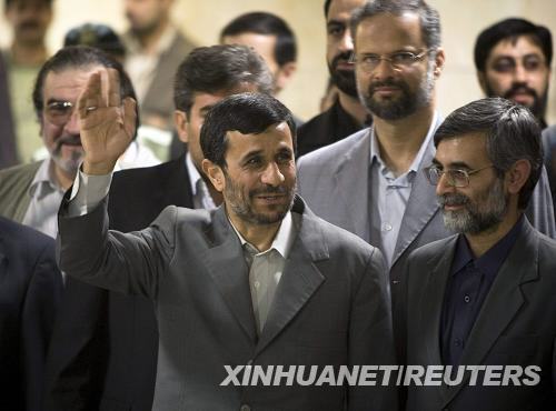 5月8日,在伊朗首都德黑兰,伊朗总统艾哈迈迪-内贾德(前左)抵达内政部正式登记参加今年6月12日举行的伊朗第10届总统选举。新华社/路透