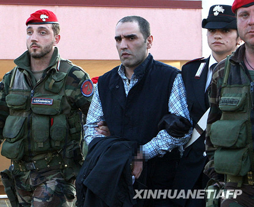 5月10日,在意大利卡拉布里亚地区,当地一个黑手党头目萨尔瓦托雷·科卢乔(中)被警方逮捕。新华社/法新
