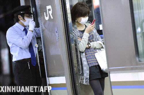5月17日,在日本兵库县神户的新干线车站内,工作人员和乘客都戴上了口罩。新华社/法新