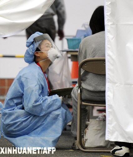 5月17日,在日本兵库县神户的一家医院,一名医务人员在发热门诊处询问病人情况。新华社/法新