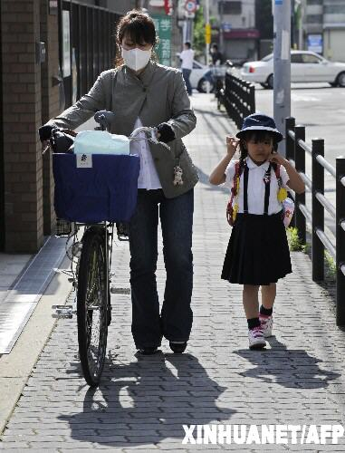 2009年5月18日 日本两地宣布1400多所教育机构停课防范新型流感 5月18日,在日本大阪市,一名小学生在学校停课后被妈妈接回家。日本大阪府和兵库县的非输入性甲型H1N1流感确诊病例近两天已从“零”飙升至120多例。为了遏制疫情蔓延,上述两地的政府部门已于18日先后要求总计1400多所教育机构暂时停课。 新华社/法新