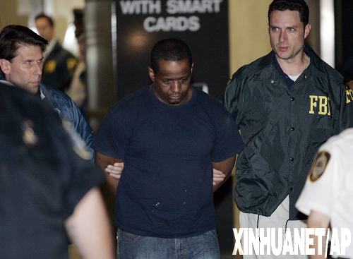 5月21日,在美国纽约,一名恐怖分子嫌犯(中)在被扣留后离开美国联邦调查局办公大楼。美国联邦调查局20日晚在纽约逮捕了4名恐怖分子嫌犯。据当地媒体报道,这4名出生在美国的恐怖分子嫌犯企图炸毁当地一家犹太教堂,并计划用导弹击落美军战机。他们还计划炸毁位于纽约市布朗克斯区的一个犹太人社区中心。新华社/路透