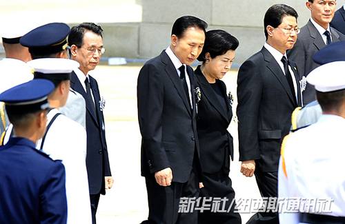 5月29日,韩国总统李明博(中)偕夫人步入首尔景福宫前院,参加在这里举行的已故前总统卢武铉的遗体告别仪式。韩国各界当天上午在位于首都首尔市中心的景福宫举行了规模盛大的前总统卢武铉遗体告别仪式。 新华社/纽西斯通讯社