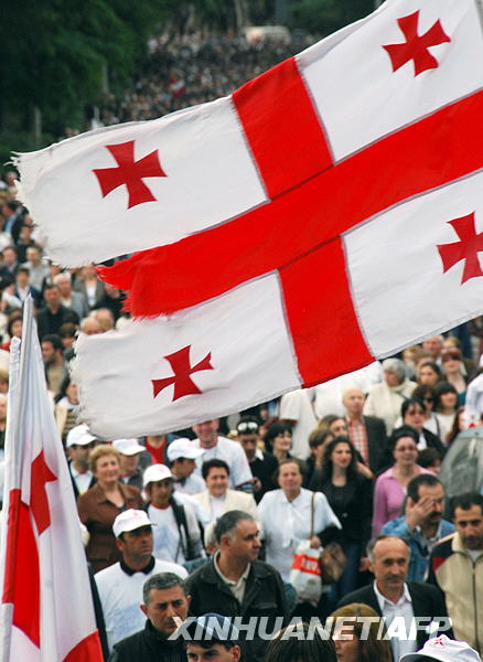 5月26日,在格鲁吉亚首都第比利斯,格反对派支持者高举国旗参加示威活动。当日,格鲁吉亚迎来独立日,格反对派从全国各地召集数万人在第比利斯举行示威活动,要求总统萨卡什维利下台。这是自2008年8月格俄冲突爆发以来,反对派举行的规模最大、持续时间最长的抗议活动。新华社/法新