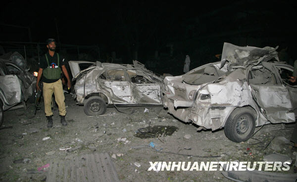 6月9日,在巴基斯坦西北边境省首府白沙瓦,一名警察站在发生爆炸的五星级酒店门口。据巴基斯坦当地电视台报道,白沙瓦市的一个五星级酒店9日晚发生炸弹爆炸,目前死亡人数已升至11人,另有约50人受伤。 新华社/路透