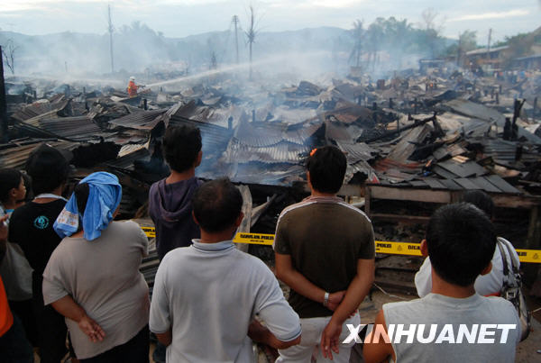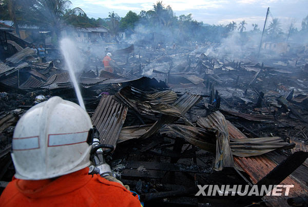 6月10日,在东马来西亚沙巴州的基纳鲁特,消防人员在火灾现场灭火。当日凌晨,基纳鲁特地区一移民聚集区发生火灾,80多幢房屋被毁,400多人失去住所。新华社发