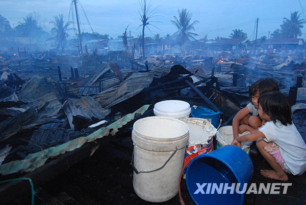 6月10日,在东马来西亚沙巴州的基纳鲁特,两名儿童蹲在火灾现场。新华社发