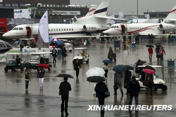 6月15日,在法国巴黎北郊的布尔歇国际展览中心,人们冒雨参观第48届巴黎国际航空航天展。新华社/路透