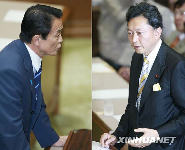 5月27日,在位于日本首都东京的国会参议院,日本首相、执政的自民党总裁麻生太郎(左)与最大的在野党民主党党首鸠山由纪夫(右)在两党党首辩论会上面对面交锋(拼版照片)。当日,日本自民、民主两党在国会举行今年首次两党党首辩论会。新华社记者 任正来 摄