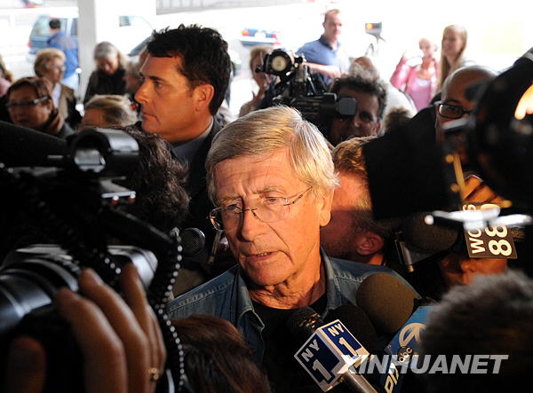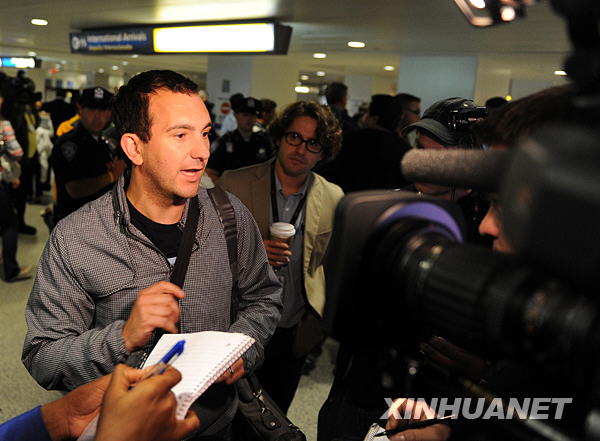 6月18日,美国大陆航空公司第61号航班的乘客海斯在新泽西州纽瓦克机场接受媒体采访。新华社记者申宏摄