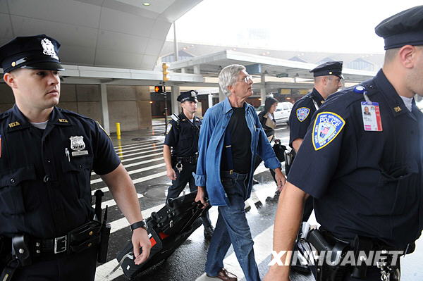 6月18日,美国大陆航空公司第61号航班的乘客在警察的护送下离开新泽西州纽瓦克机场。新华社记者申宏摄