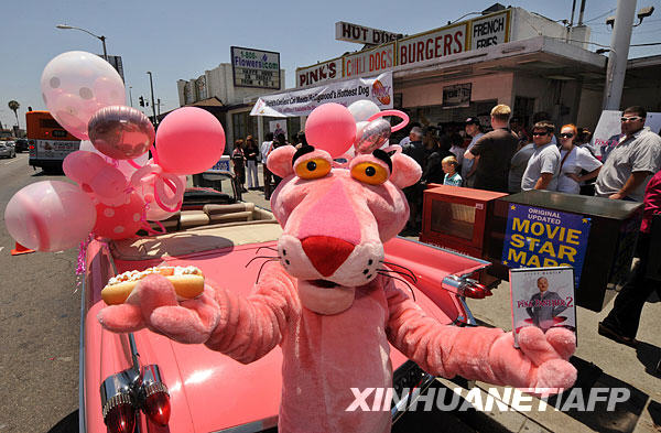 6月24日,在美国洛杉矶街头,一名装扮成粉红豹形象的宣传者在一家热狗店门前为新片《粉红豹2》的DVD和蓝光光盘的发行作宣传。新华社/法新