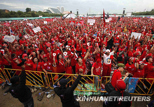 6月27日,泰国反独裁民主联盟(反独联)支持者在曼谷市中心的王家田广场举行大规模反政府集会,要求总理阿披实解散国会,举行大选。 新华社/路透
