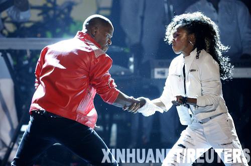 6月28日,美国著名黑人影星杰米·福克斯(左)担任“黑人娱乐电视”奖颁奖嘉宾并现场模仿已故流行乐巨星迈克尔·杰克逊的表演。2009年度“黑人娱乐电视”奖颁奖仪式当天在美国西部城市洛杉矶举行。新华社/路透