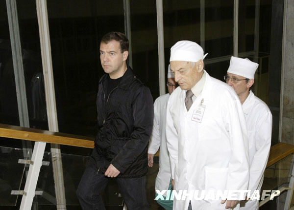 6月23日,在俄罗斯首都莫斯科,俄总统梅德韦杰夫(左一)在医生陪同下探望身受重伤的俄罗斯印古什共和国总统尤努斯·贝克·叶夫库罗夫。叶夫库罗夫的车队22日上午在印古什共和国首府纳兹兰市附近遭自杀式汽车炸弹袭击,造成多人死伤,他本人也身受重伤。新华社/法新