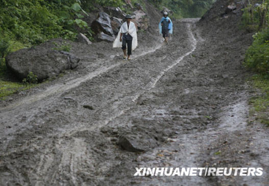 7月6日,在越南北部北件省,人们行走在被洪水冲毁的道路上。越南防洪指导委员会当日说,肆虐3天的山洪已造成至少20人死亡,18人失踪,越南北部多处道路和房屋损毁。新华社/路透