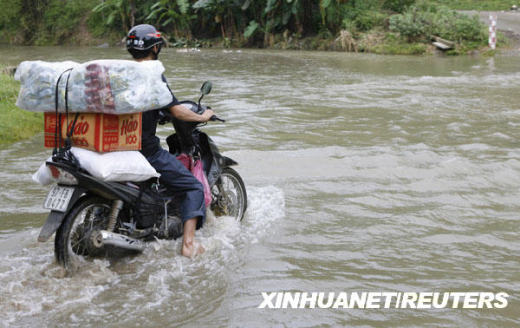 7月6日,在越南北部北件省,一名男子骑摩托车行进在被洪水淹没的道路上。越南防洪指导委员会当日说,肆虐3天的山洪已造成至少20人死亡,18人失踪,越南北部多处道路和房屋损毁。新华社/路透