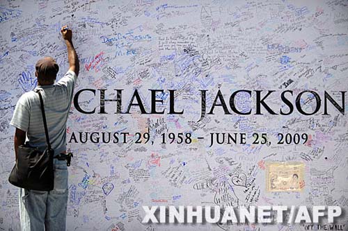 7月5日,在美国洛杉矶市中心的斯台普斯中心门口,一名歌迷在迈克尔·杰克逊的海报上签名。新华社/法新