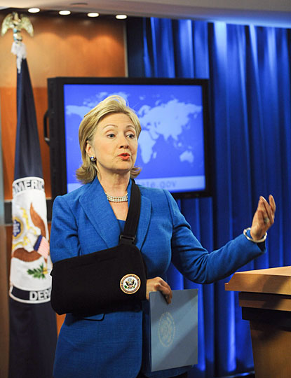 美国当地时间7月7日,美国国务卿希拉里与在军事政变中遭驱逐的洪都拉斯总统曼努埃尔·塞拉亚进行会谈后,举行记者招待会。