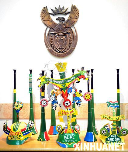 6月29日,世界杯推广活动上的2010年世界杯宣传纪念品。当日,南非共和国驻香港特别行政区领事馆举行新闻发布会宣布,南非政府为庆祝2010年主办世界杯,将在香港举行为期一年的推广活动。新华社记者卢炳辉摄