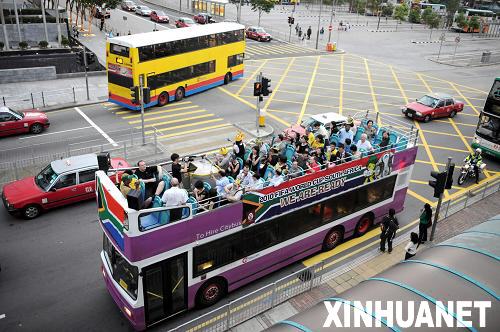 6月29日,宣传巴士在马路上巡游。当日,南非共和国驻香港特别行政区领事馆举行巴士巡游,宣传2010年南非世界杯。新华社记者卢炳辉摄