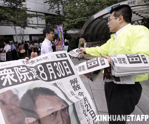 7月13日,一名日本男子在东京分发刊登举行众议院大选消息的报纸特刊。据日本媒体报道,日本首相麻生已同意下周解散众议院,并在8月30日举行大选。新华社/法新
