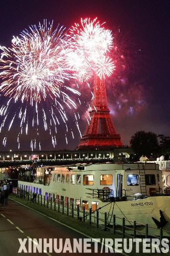 2009年7月14日 埃菲尔铁塔上空燃放焰火庆国庆 7月14日,在法国首都巴黎,焰火在埃菲尔铁塔上空燃放。当日,法国庆祝第220个国庆日以及埃菲尔铁塔落成120周年。 新华社/路透