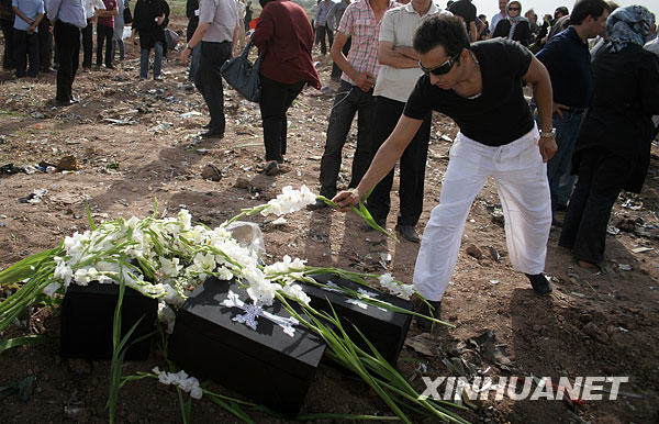 7月16日,在伊朗西北部城市加兹温附近的坠机现场,一名男子向模拟棺盒献花。一架由伊朗首都德黑兰飞往亚美尼亚首都埃里温的伊朗客机15日在加兹温附近坠毁,机上168人全部遇难。新华社发(哈拉比萨斯摄)