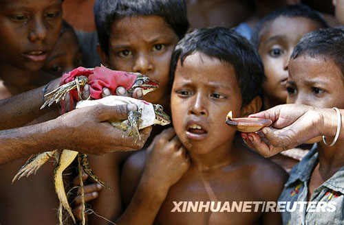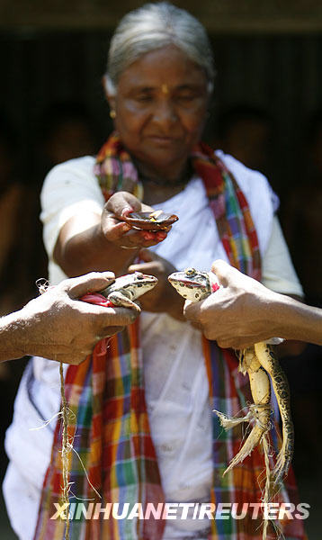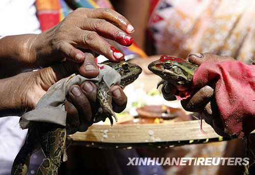 7月19日,在印度城市西里古里以东约85公里的一处村庄,村民举行仪式为两只青蛙“完婚”。为青蛙举行婚礼是当地习俗,以求风调雨顺、五谷丰登。新华社/路透