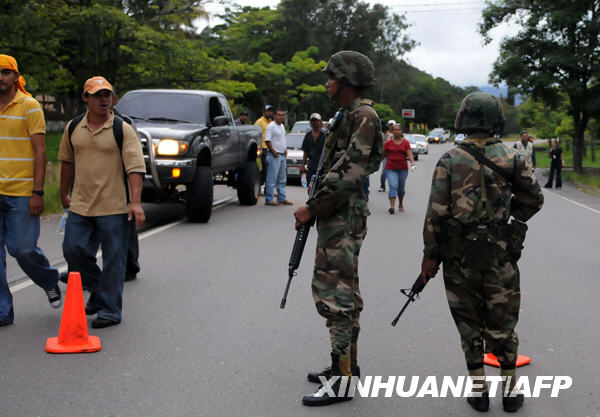 7月23日,在洪都拉斯境内的一条道路上,被罢免总统塞拉亚的支持者从士兵身边走过,准备前往洪尼边境迎接塞拉亚。塞拉亚当日下午从尼加拉瓜首都马那瓜出发,亲自驾车前往洪都拉斯,目前已经抵达距离洪都拉斯边境40公里的尼加拉瓜北部城市埃斯特利。 新华社/法新