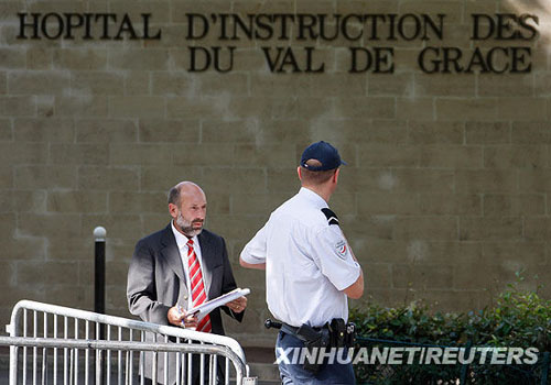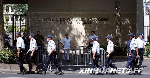 7月26日,安全人员在法国首都巴黎的瓦勒德格拉斯军队医院门口警戒。当日,法国总统萨科齐因身体不适,被送往瓦勒德格拉斯军队医院接受检查和治疗。随后,法国总统府秘书长克洛德·盖昂向媒体表示,萨科齐目前仍在医院接受治疗,不过他的病情已无大碍。 新华社/法新