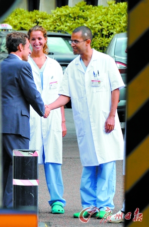 ▲萨科齐出院时与主治医生握手告别。
