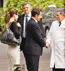 萨科齐与医生握手,在妻子布鲁尼陪同下出院。