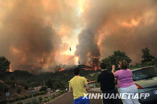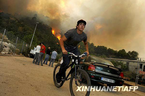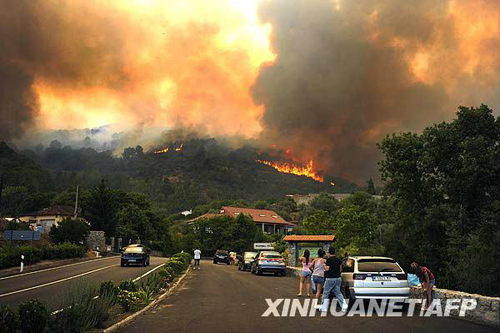 7月28日,在西班牙中部城市阿维拉附近,人们在远处观望森林大火。当日,西班牙部分地区气温高达40摄氏度,西班牙内政部向该国四分之三地区发布了最高级别森林火险预警。新华社/法新